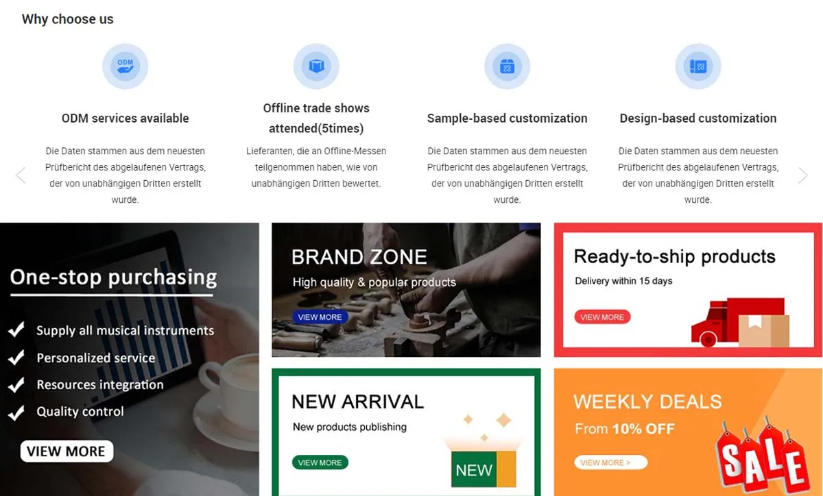 We have the most suppliers of Musical Instruments in China. We have our own factories for piano, guitar, violin and wind. You can check all our products on our website :www.shunuo.net.cn.